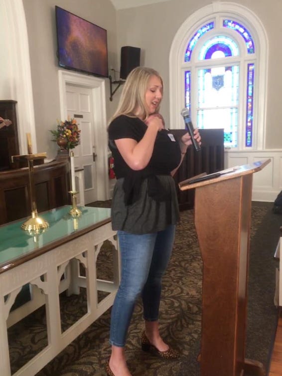 .Me, two weeks post-partum c-section, wearing baby girl, and high heels, to deliver a sermon. Because, if not me, then who? The answer: Literally anyone else.